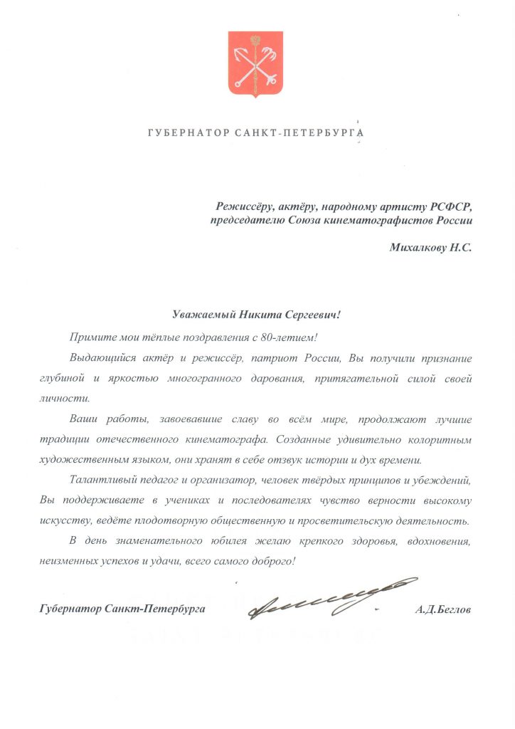 Вы неизменно остаётесь примером творческой энергии, гражданской позиции и верности искусству. Ваш вклад в развитие отечественного кино — огромен, а Ваша личность вдохновляет всех, кто работает в сфере культуры и киноискусства.