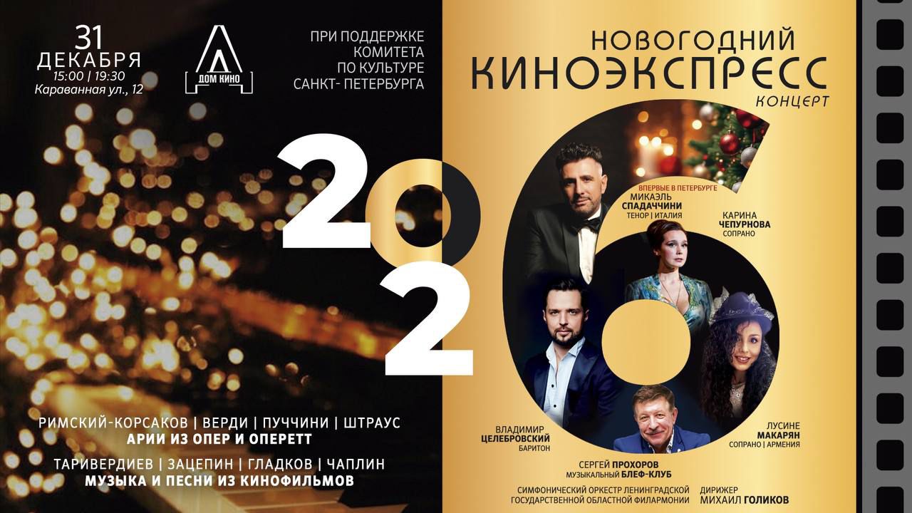 «Новогодний Киноэкспресс»: концерт-праздник с оперными звёздами Италии и Армении, симфоническим оркестром и любимыми мелодиями кино — состоится 31 декабря в 15:00 и в 19:00 часов в Большом зале Дома Кино.