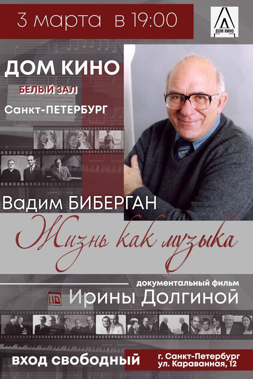 3 марта в 19:00 в Белом зале Дома Кино состоится показ документального фильма Ирины Долгиной «Вадим Биберган. Жизнь как музыка».